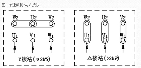 1、單速風(fēng)機接線方法:一般情況下,所配電機功率在3kW(包括3kW)以下為Y接法;3kW以上為△接法。接線圖如下: