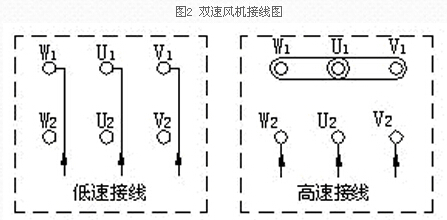 2、雙速風(fēng)機接線方法:本廠雙速風(fēng)機所配雙速電機其定子繞組為△/YY(或Y/YY)接法。接線圖如下: